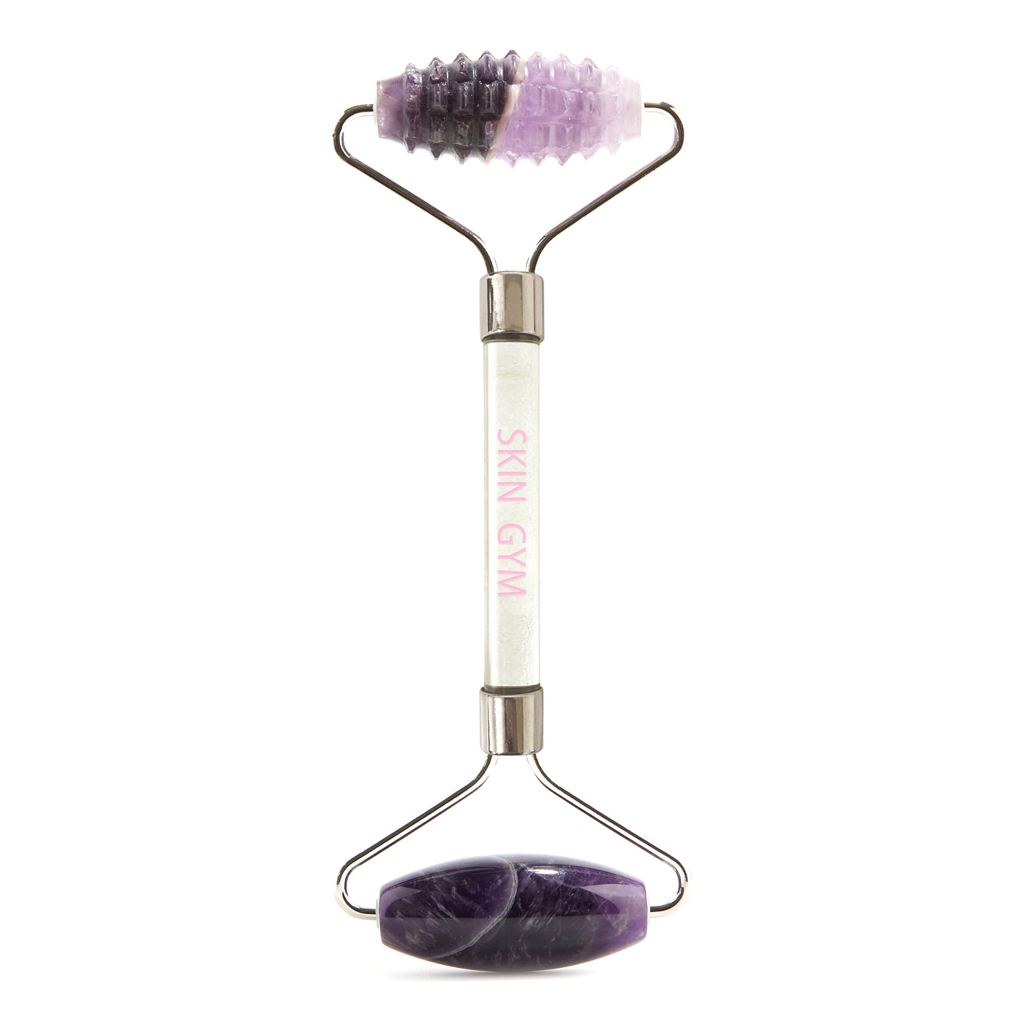 Enhance complexion with Skin Gym 2D Amethyst Roller. Double-sided, texturized, studded with soothing Amethyst crystals. Boost skincare, promote spiritual well-being.