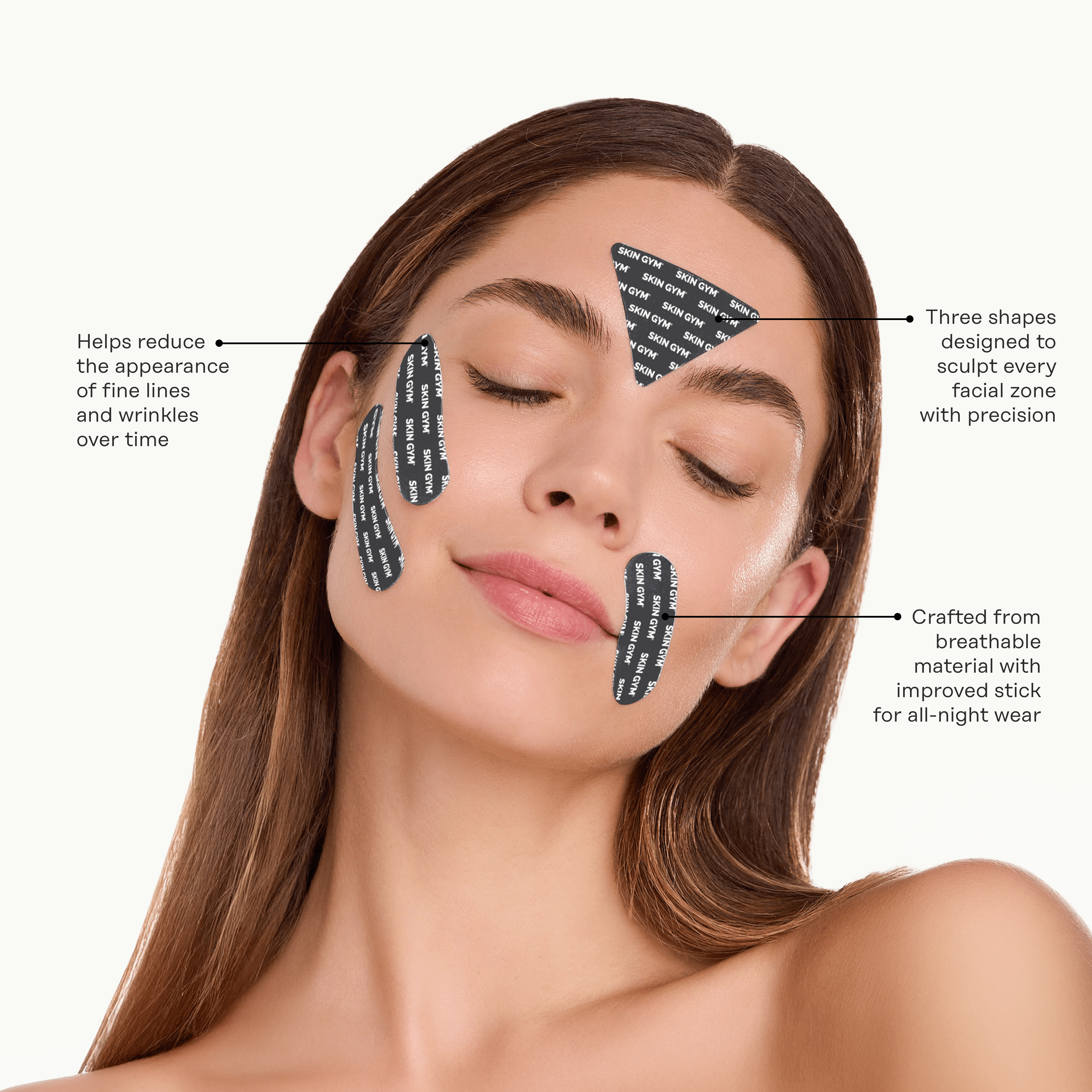 Skin Gym Face Tape is a non-invasive, skin-smoothing tape designed to help visibly reduce the appearance of fine lines and wrinkles by gently lifting and tightening targeted areas of the face.